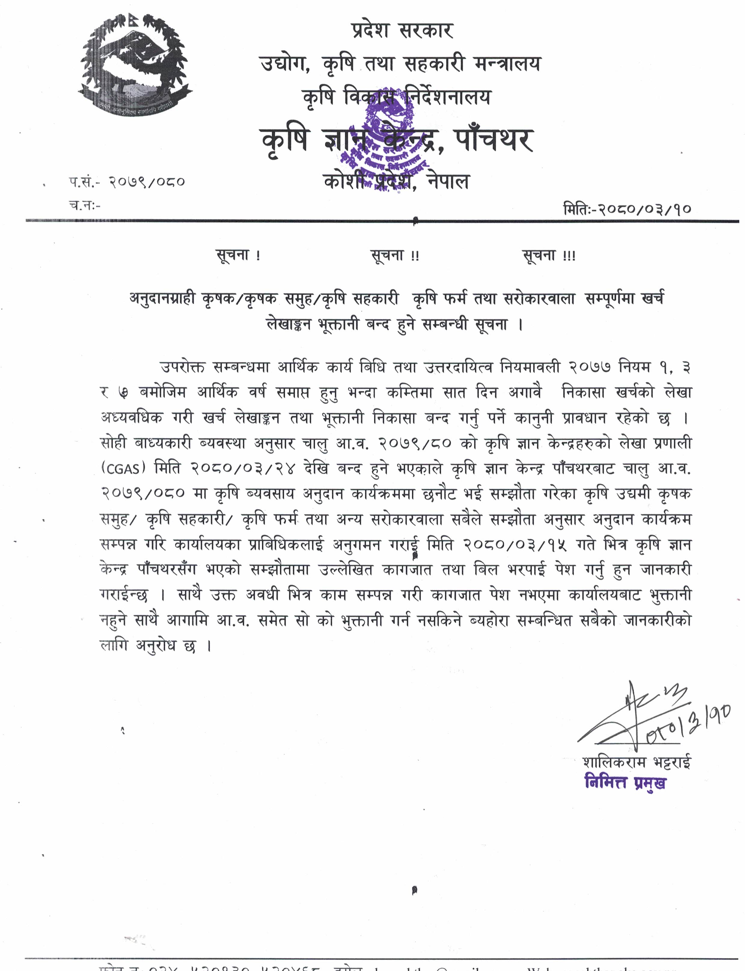 अनुदानग्राही कृषक/कृषक समुह/कृषि सहकारी कृषि फर्म तथा सरोकारवाला सम्पूर्णमा खर्च लेखाङ्कन भूक्तानी बन्द हुने सम्बन्धी सूचना । 2080-03-10 Closed !!!